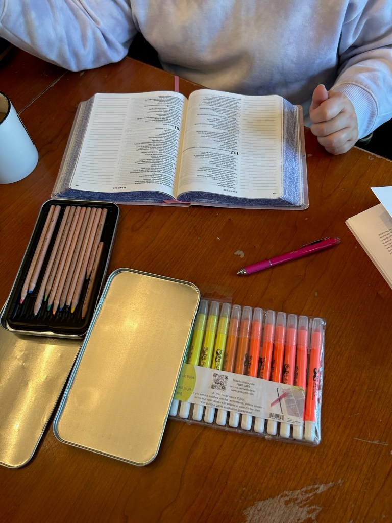 Once we returned to our regular fall school schedule, however; it became readily apparent that taking a leisurely two hours of Bible journaling every morning wasn’t really going to be doable on a daily basis. We needed a solution that worked well for our rather unusual schooling schedule. Due to a variety of reasons, we have chosen to do school Monday–Thursday and Saturday so that we can take Fridays off. In general, I try to ensure that Saturday is a bit of a lighter school day, so I have found that Bible journaling works well with the weekend rhythm we have established. We use shorter daily devotionals for the heavier Monday through Thursday school days, but we all truly look forward to easing into the weekend