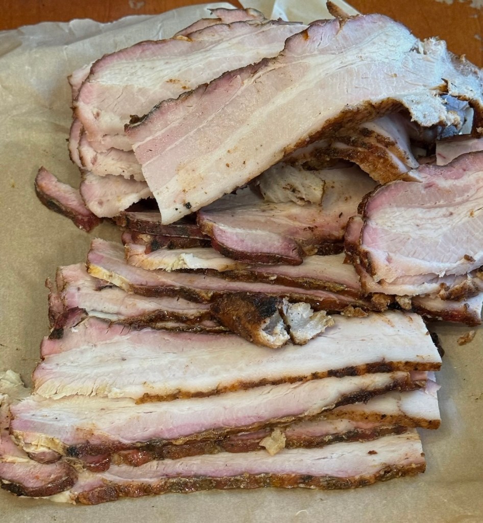We have discovered that smoked pork belly is so delicious and yummy, not to mention an extremely low sodium version of bacon that really hits the spot! We have some history of hypertension in our family, so watching our sodium is a must. Don’t get me wrong, smoked pork belly is not a health food by any means! But it is a delicious treat that is much lower in sodium than traditional bacon. If you are looking for low sodium bacon alternatives, you’re in the right place!